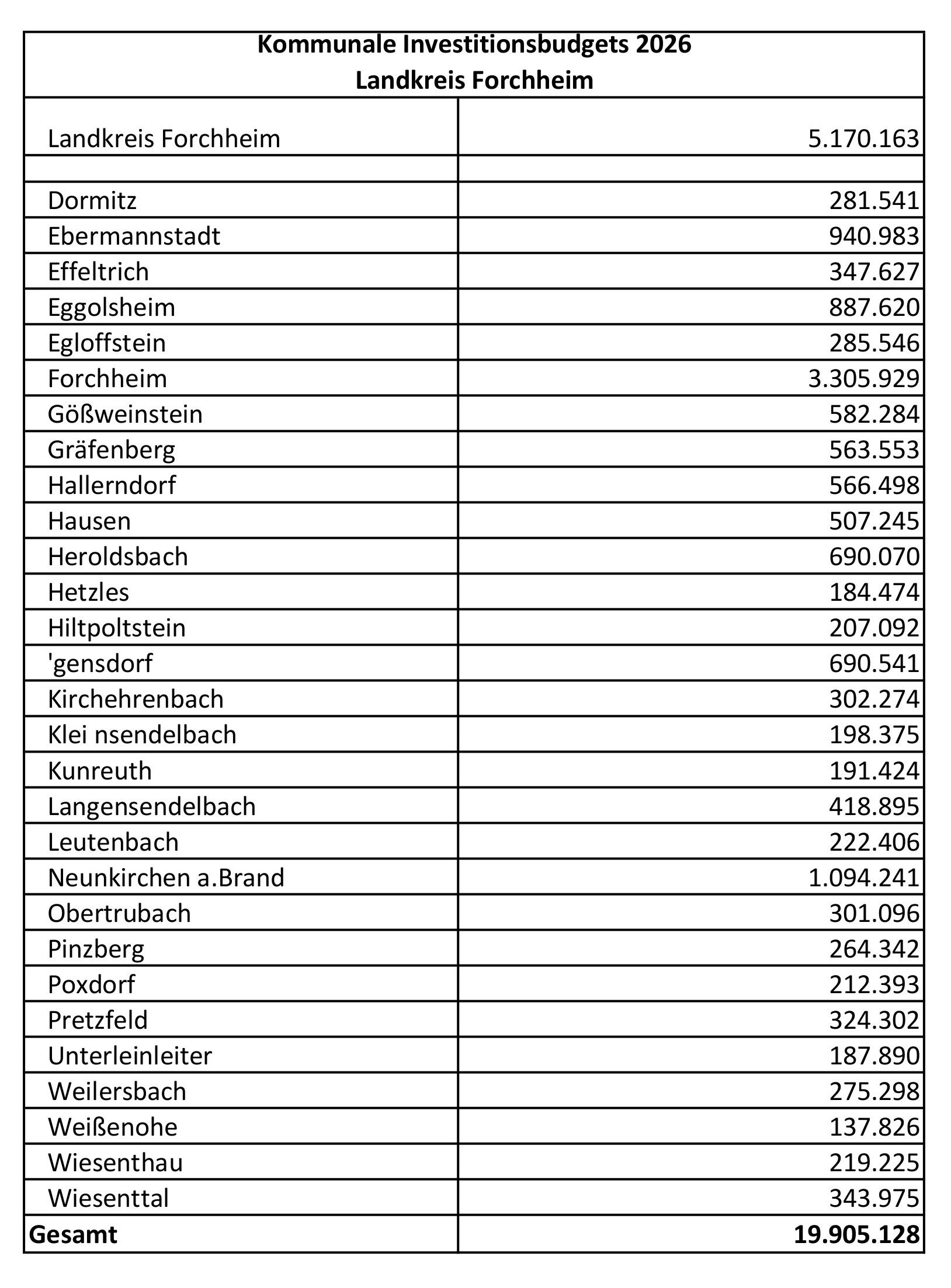 Dabei entfallen auf den Landkreis Forchheim 19.905.128 für förderfähige Projekte. Die Mittel können bei Umsetzung konkreter Investitionsprojekte abgerufen werden. Rund 14,7 Millionen gehen an die 29 Kommunen, die Städte, Märkte und Gemeinden im Landkreis, für den Landkreis selbst stehen über 5 Millionen für Investitionen bereit.