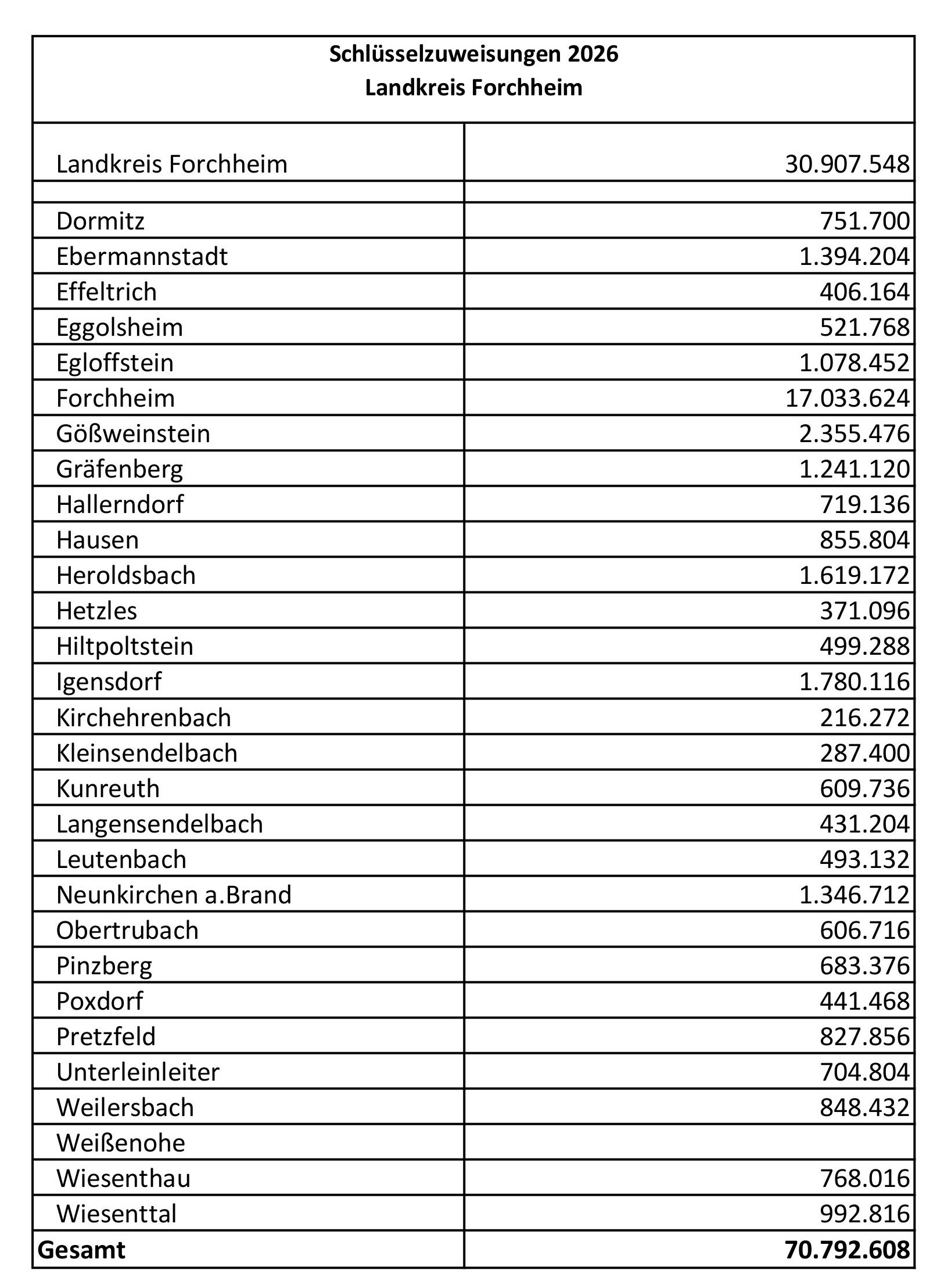 In den Landkreis Forchheim fließen im kommenden Jahr Schlüsselzuweisungen mit einer Rekordsumme in Höhe von 70.792.608. Der Landkreis wird mit 30.907.548 Euro unterstützt, die Gemeinden erhalten 39.885.060 Euro. „Auch in Zeiten steigender Kosten gilt: Unsere Kommunen können sich auf den Freistaat Bayern verlassen! “ sagt Landtagsabgeordneter Michael Hofmann. Er stellt dabei heraus: Unser Landkreis bekommt im Vergleich zum letzten Jahr bei den Schlüsselzuweisungen ein Plus an über 26 Millionen Euro.
